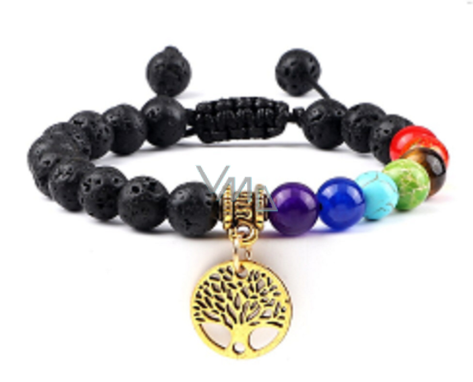 Čakrový náramek Strom života + Láva černá, ručně pletený, nastavitelná velikost, kulička 8 mm, zrozen ze čtyř živlů