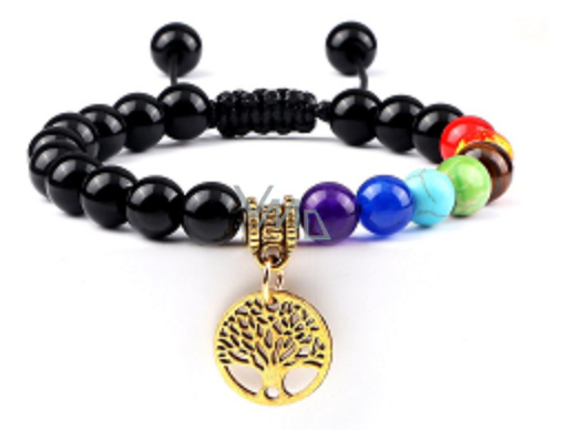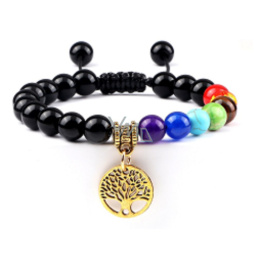 Čakrový náramek Strom života + Obsidian, přírodní kámen, ručně pletený, nastavitelná velikost, kulička 8 mm, kámen záchrany