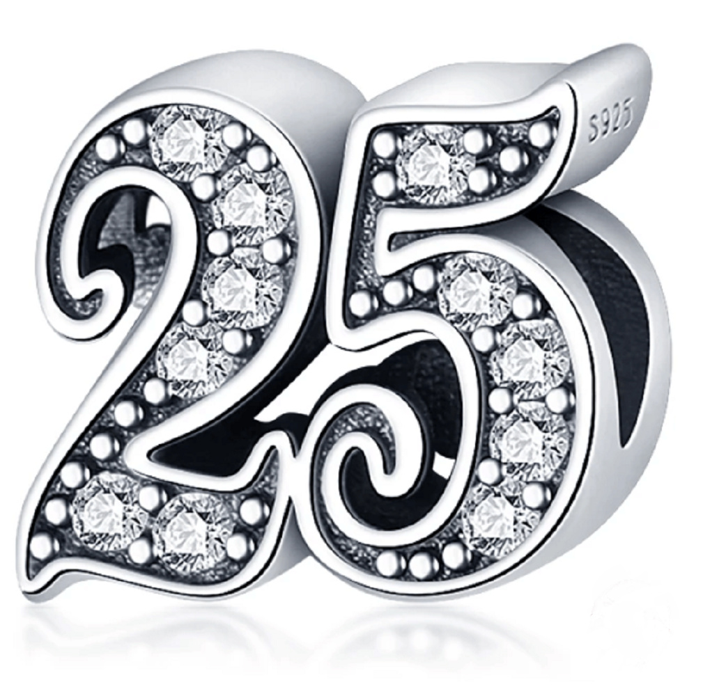 Tento přívěsek pro náramky, vyrobený na oslavu 25. výročí nebo nezbedných 25 narozenin, je zvýrazněn kubickými Zirkony a korálkovými detaily.