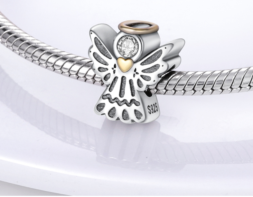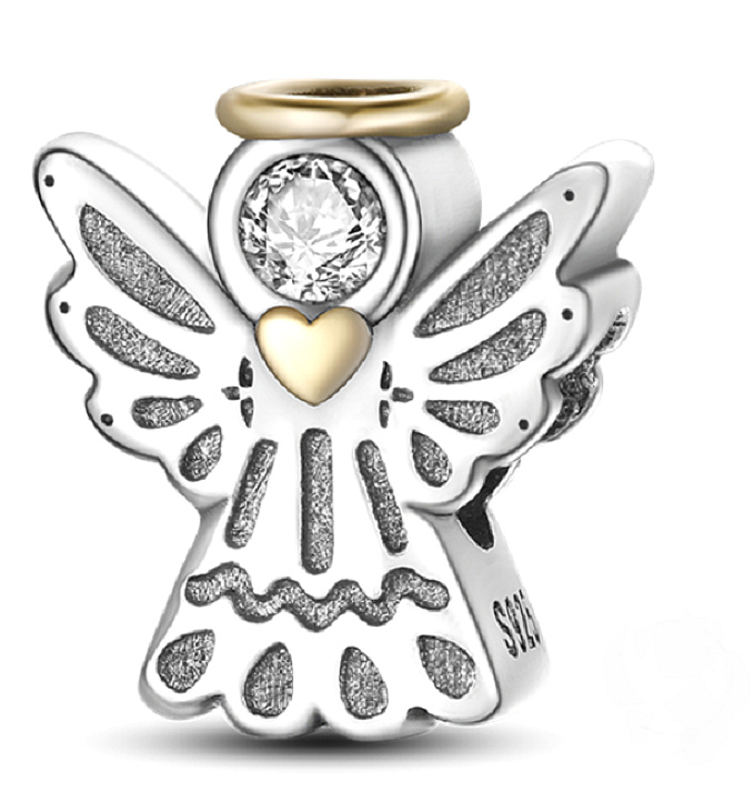 Přívěsek s malým andělem strážným, pozlacený a navržený s třpytivým bílým drahokamem Zirkonem. Je vyroben s povrchovou úpravou rhodium, která chrání před černáním a zvyšuje lesk šperků.