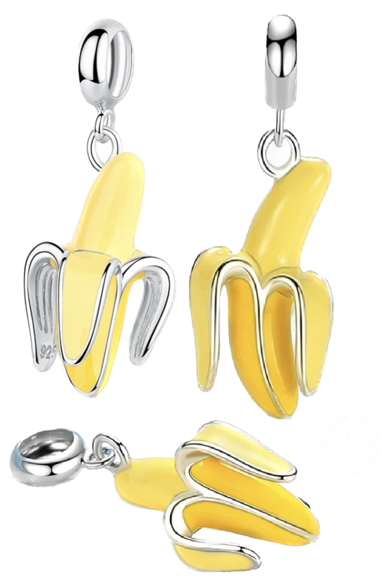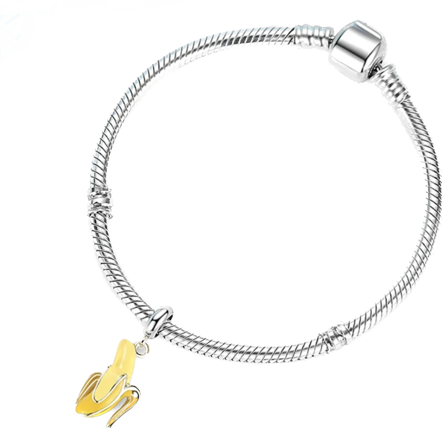 „Bez banánu ani ránu.“ Visací přívěsek s banánem, zdoben hladkým žlutým smaltem. Vyprávějte svůj příběh s každým přívěskem a vytvořte náramek, který odráží, kdo jste a co je pro vás důležité. Tvůj styl. Váš náramek. Tvůj příběh.