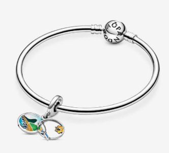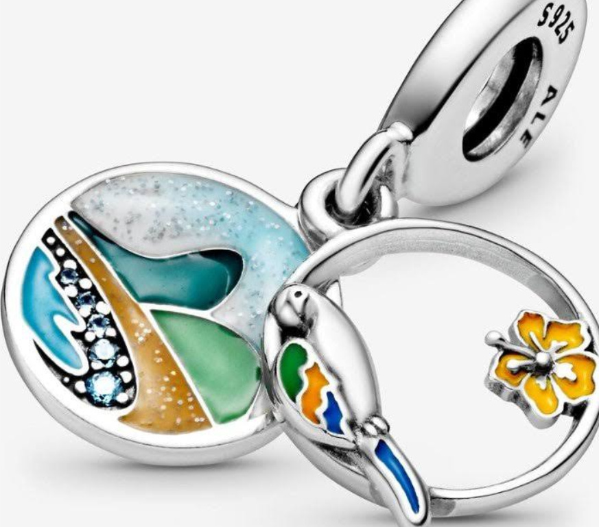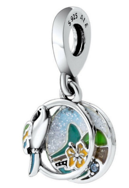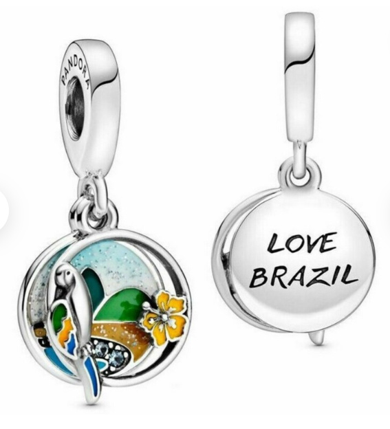Přiveďte zpět vzpomínky na Brazílii s tímto barevným visícím kouzlem! Přední disk se skládá ze dvou prvků a představuje papouška s jasným peřím a žlutým smaltovaným květem ibišku. Za třpytivou plážovou scénou je vyobrazena modrá a zelená smalty a bleděmodré kameny. Na zadní straně přívěsku je vyrytý nápis „Love Brazil“.