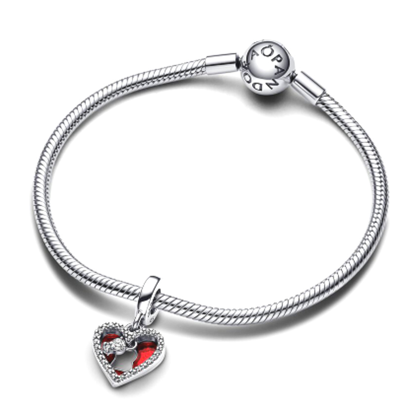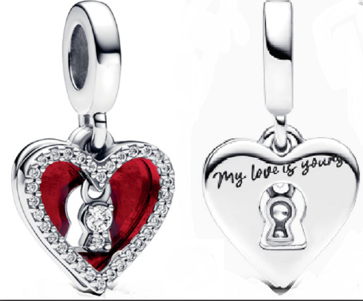 Tento přívěsek se vyznačuje dlážděným obrysem srdce s malým kroužkem ve tvaru klíčové dírky uprostřed. Za ním je disk ve tvaru srdce se zářivě červeným smaltem a výřezem, který dokonale ladí s věšákem na klíčovou dírku. Na zadní straně je vyrytý vzkaz "Moje láska je tvá". Perfektní doplněk k vašemu speciálnímu náramku, nebo držáku na kouzlo.