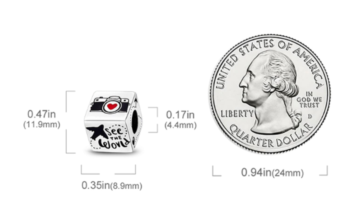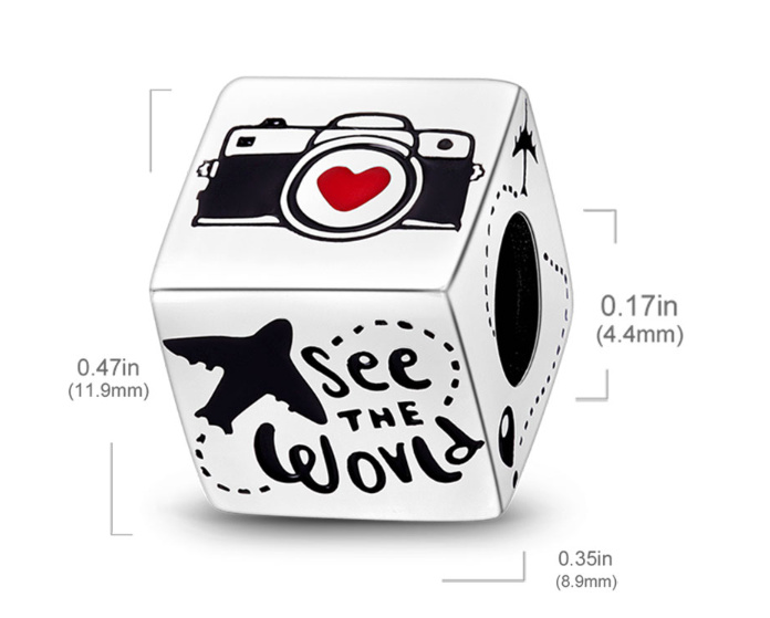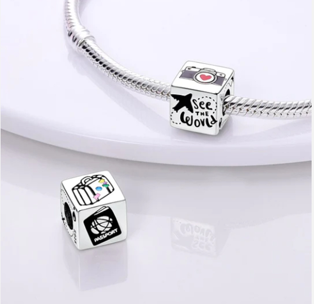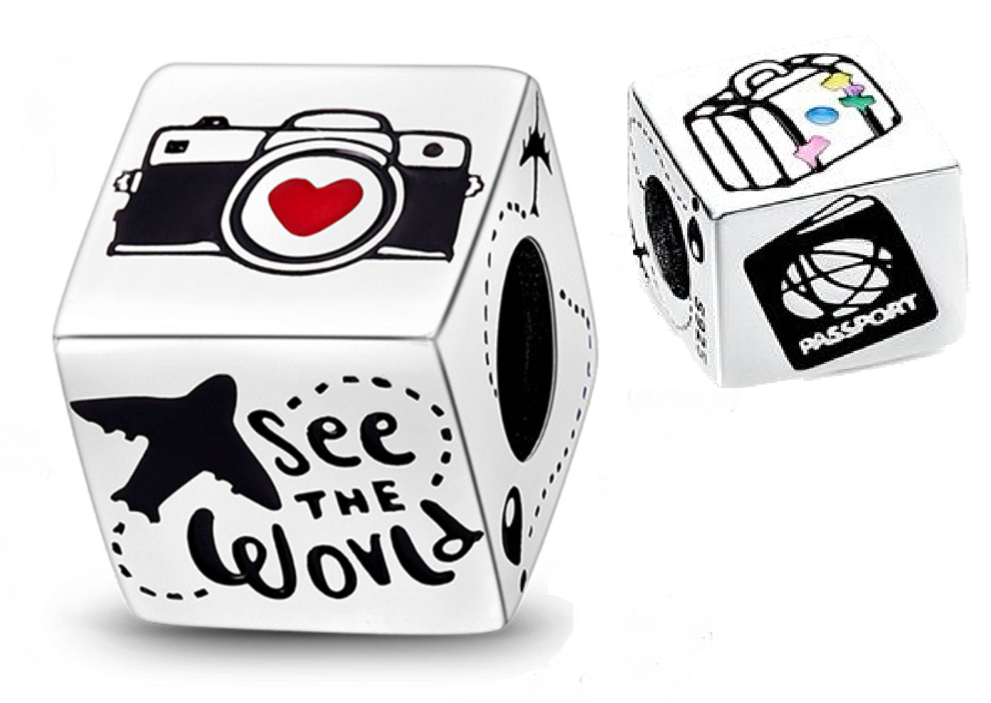 Přívěsek ve tvaru kostky s cestovními obrázky, včetně malého kufříku, Letadla s nápisem „vidět svět“, fotoaparátu s malým červeným srdcem a pasu. Navrženo s hladkým barevným smaltem.