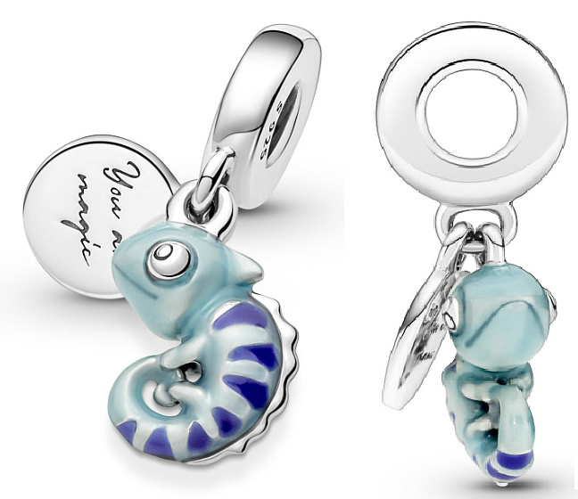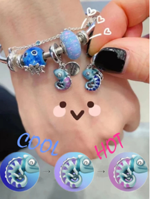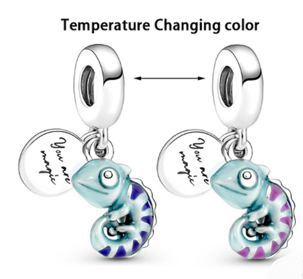 Tento transformující se chameleon je symbolem přizpůsobivosti a změny a připomíná vám, že máte žít život v celé jeho barevné škále. Tento visací přívěsek s Chameleonem je opatřený speciálním termochromatickým smaltem, který mění barvu v závislosti na změně teploty – od světle modrozelené přes tmavomodrou na těle až po tmavofialovou a růžovou na pruzích. Na malé destičce připevněné na očku je nápis „You are magic“, který vám připomene vašeho vnitřního Chameleona.