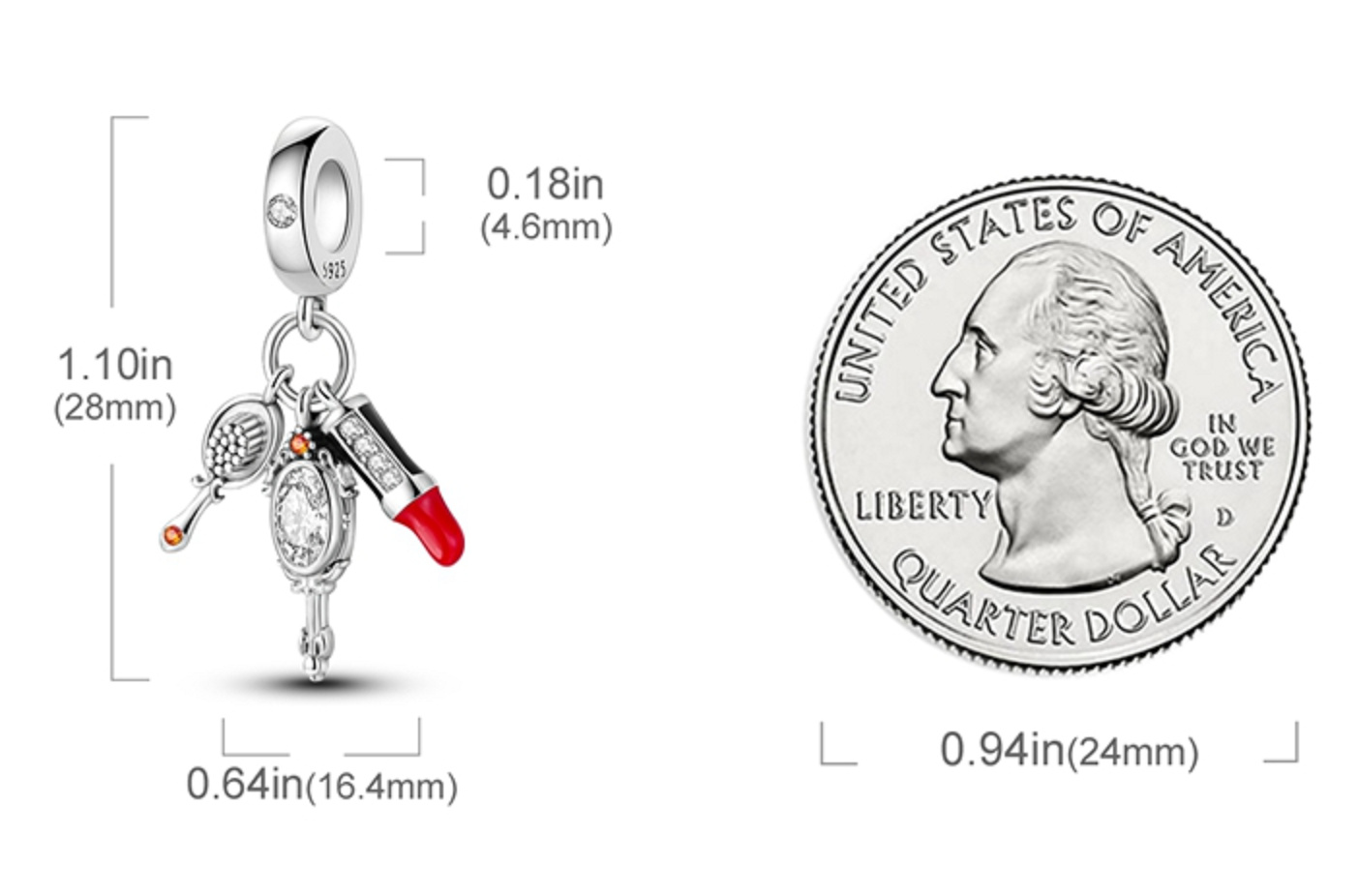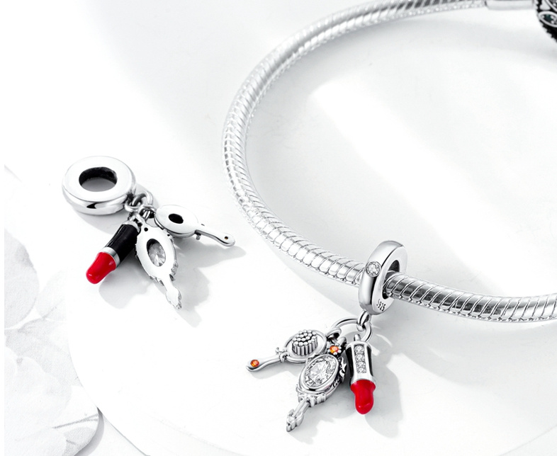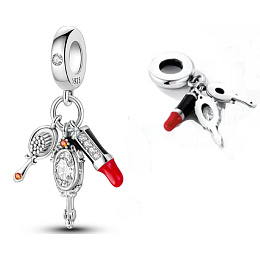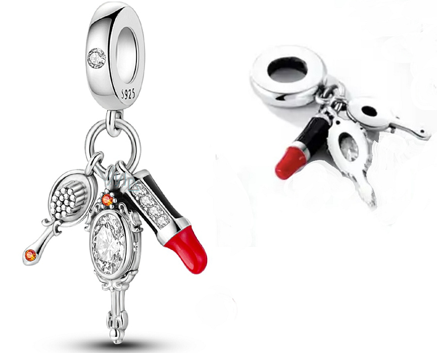 Visací přívěsek s červenou rtěnkou, zrcátkem a štětečkem s bílými a oranžovými třpytivými zirkonovými drahokamy a hladkým červeným a černým smaltem. S každým přívěskem vyprávějte svůj příběh a vytvořte náramek , který odráží, kdo jste a co je pro vás důležité. Tvůj styl. Váš náramek. Tvůj příběh.