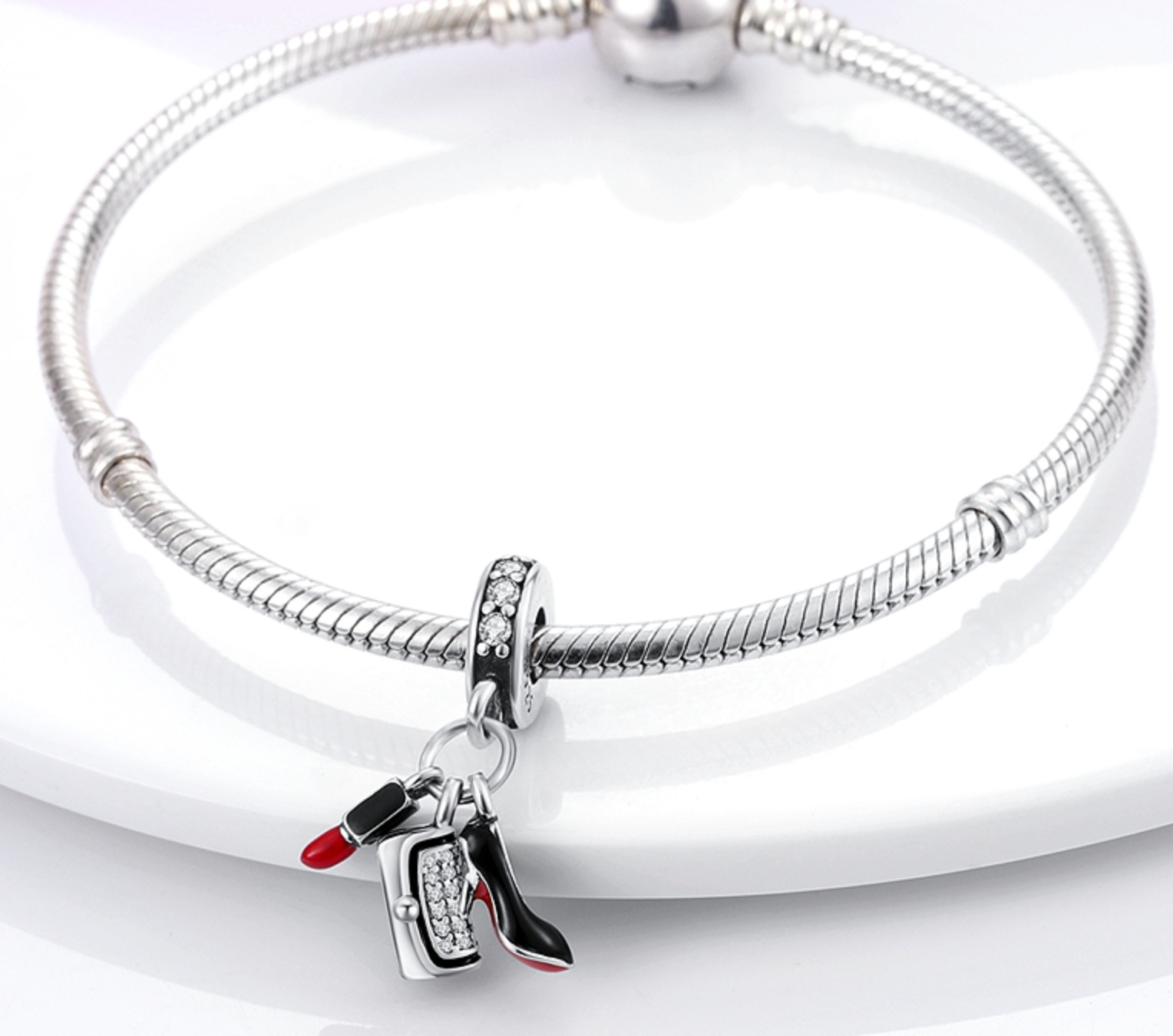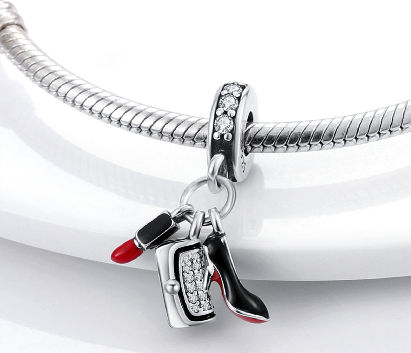 Večerní nezbytnosti. Ženské předměty - rtěnka, kabelka a špendlík. Visací přívěsek se sexy lodičkou na vysokém podpatku, rtěnkou a kabelkou s bílými třpytivými zirkonovými drahokamy a hladkým barevným smaltem. S každým přívěskem vyprávějte svůj příběh a vytvořte náramek, který odráží, kdo jste a co je pro vás důležité. Tvůj styl. Váš náramek. Tvůj příběh.