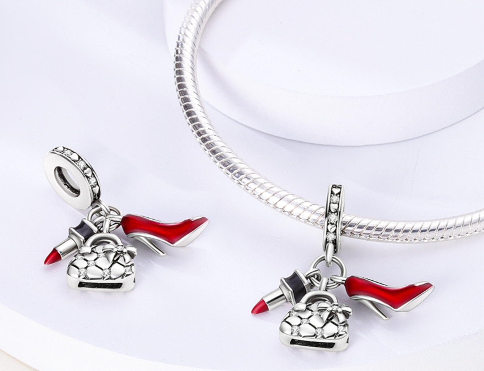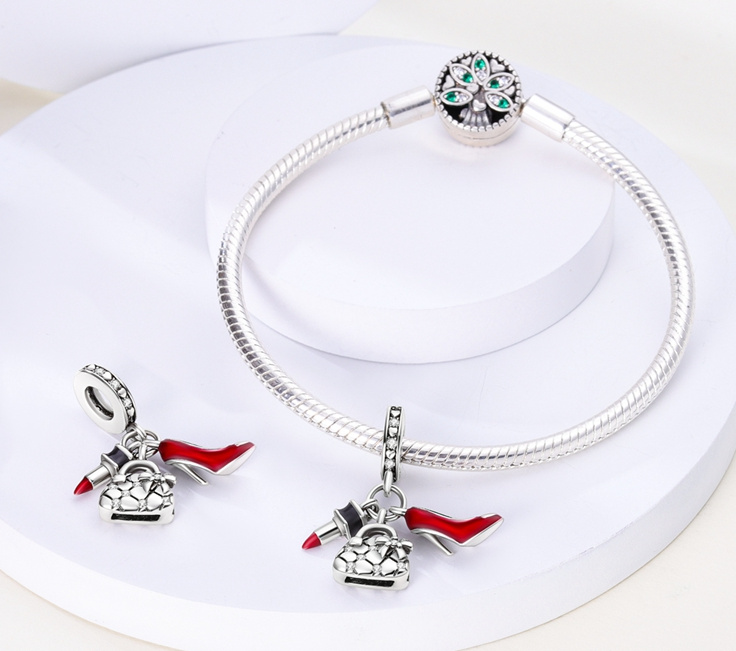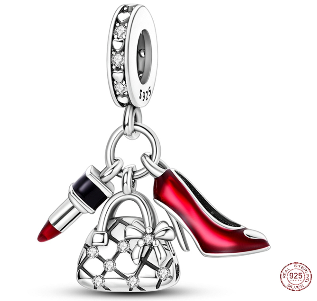 Visací přívěsek s červenou rtěnkou, roztomilou kabelkou a sexy botou na vysokém podpatku, dekorován bílými třpytivými zirkonovými drahokamy a hladkým červeným a černým smaltem. S každým přívěskem vyprávějte svůj příběh a vytvoř náramek, který odráží, kdo jsi a co je pro tebe důležité. Tvůj styl. Tvůj náramek. Tvůj příběh.