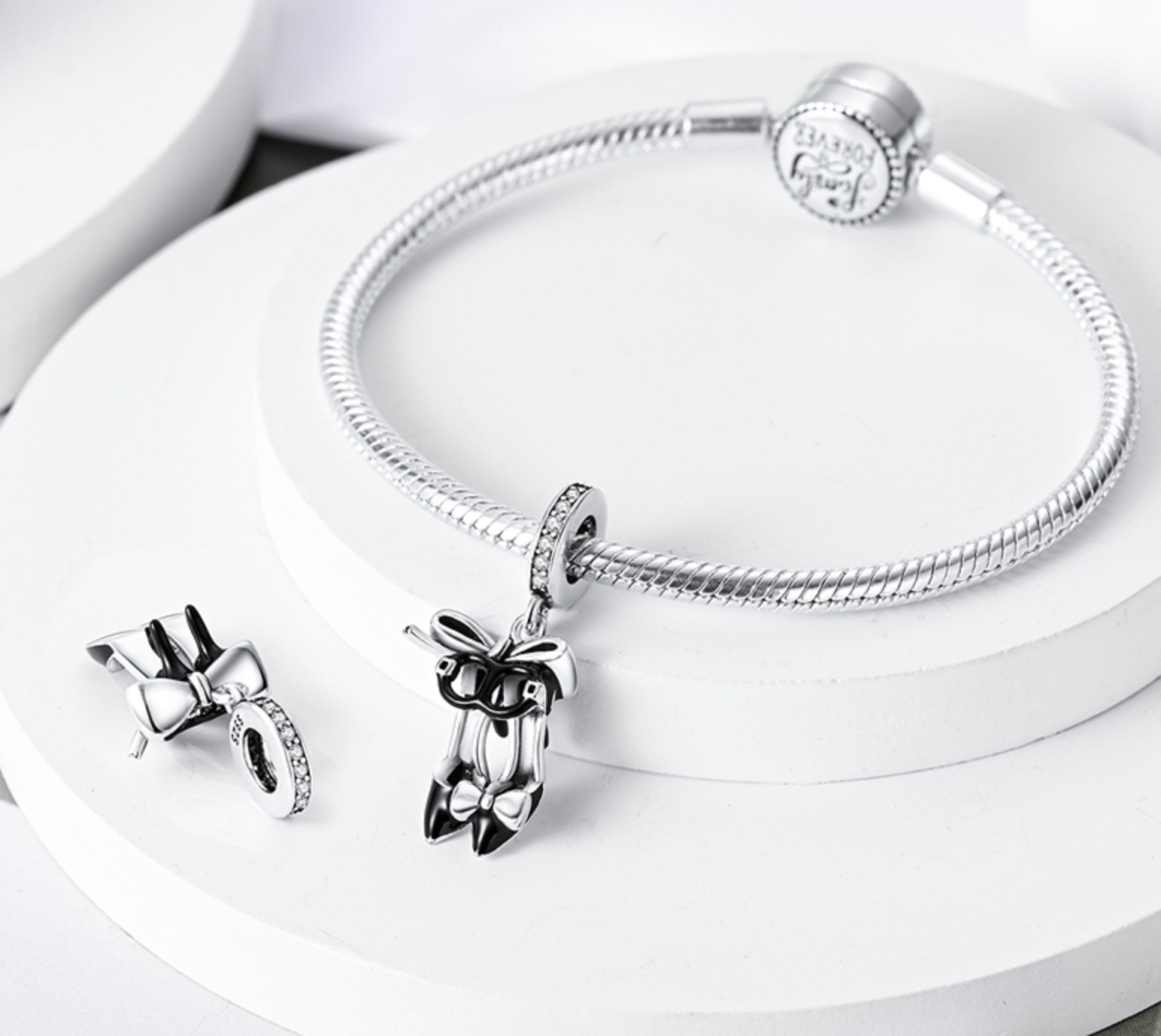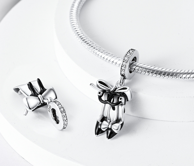 Visací přívěsek s párem šněrovaných bot na vysokém podpatku, dekorovány hladkým černým smaltem a bílými třpytivými drahokamy Zirkonu. S každým přívěskem vyprávěj svůj příběh a vytvoř si náramek, který odráží, kdo jsi a co je pro tebe důležité. Tvůj styl. Tvůj náramek. Tvůj příběh.