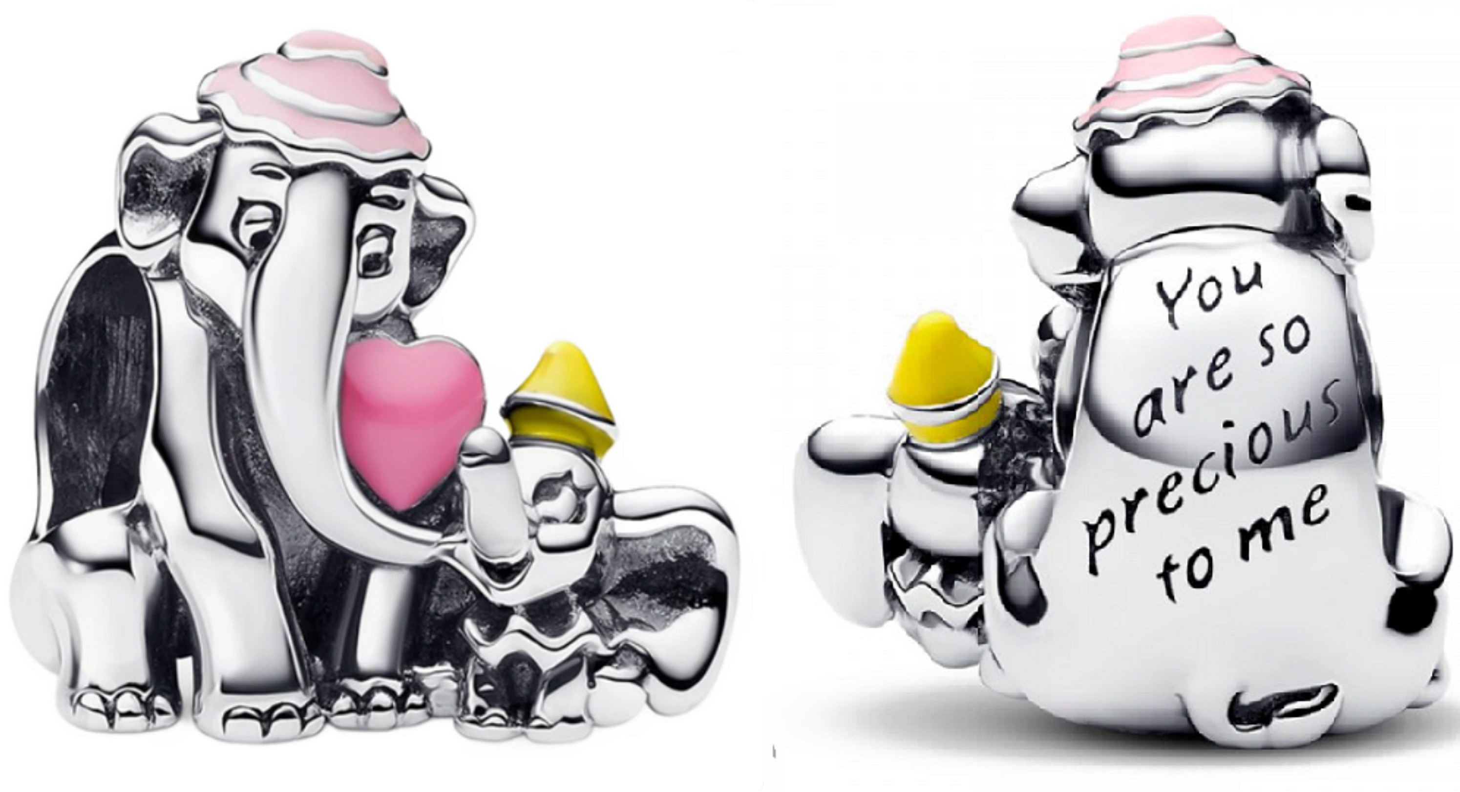 Kouzlo mateřské lásky: Tento něžný přívěsek zachycuje hluboké pouto mezi matkou a dítětem – ikonický moment, kdy se Dumbo s paní Jumbovou láskyplně objímají kolem růžového srdce. Je to víc než šperk – je to malá připomínka síly objetí, podpory a bezpodmínečné lásky, která nás formuje a vede. S vyrytým vzkazem: You are so precious to me" - Jsi mi tak drahý.