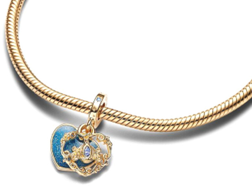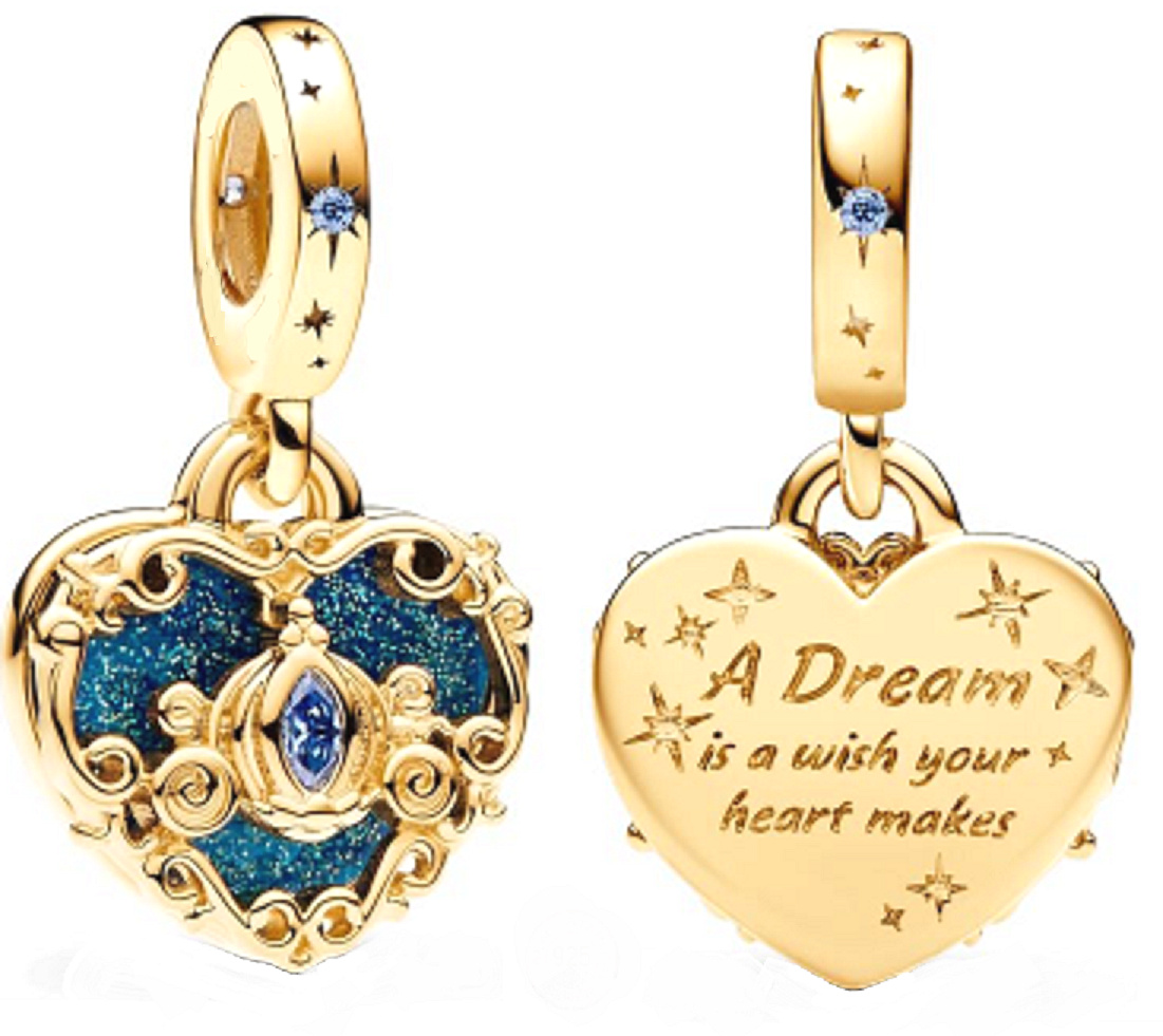 Tento jemně pozlacený přívěsek 14karátovým zlatem, inspirovaný Popelčiným milovaným příběhem, obsahuje dva disky ve tvaru srdce. Jeden představuje Popelčin kouzelný kočár ve složitém prolamovaném díle s modrým kamenem ve tvaru markýzy uprostřed. Za ním se nachází druhý kotouč ve tvaru srdce s třpytivě modrým smaltem a na zadní straně je vyrytý vzkaz „Sen je přání tvého srdce“. Noste jej na svém oblíbeném náhrdelníku, náramku nebo přívěsku jako připomínku síly následování svých snů.