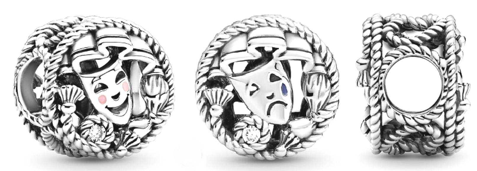 Vyjádřete své emoce světu pomocí TragiComic Mask. Toto sofistikované kouzlo je inspirováno komedií a sebevyjádřením. Usměvavou komiksovou masku zdobí tvář s růžovým smaltem, protější tragickou masku pak zdobí slzy z modrého smaltu. Maska je orámována 3D krajkou a provazy připomínajícími střapce, zdobená třpytivým syntetickým drahokamem na obou stranách a propojená do srdce. Přijměte své dvojí pocity osobním stylem.