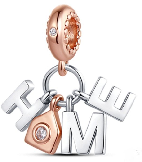 Visací přívěsek s písmeny, která vysvětlují slovo „Home“. Písmeno „o“ představuje malý domeček pozlacený růžovým zlatem, zdobený bílým třpytivým Zirkonem. Prsten přívěsku je rovněž pozlacený růžovým zlatem a zdobený bílým třpytivým Zirkonem.