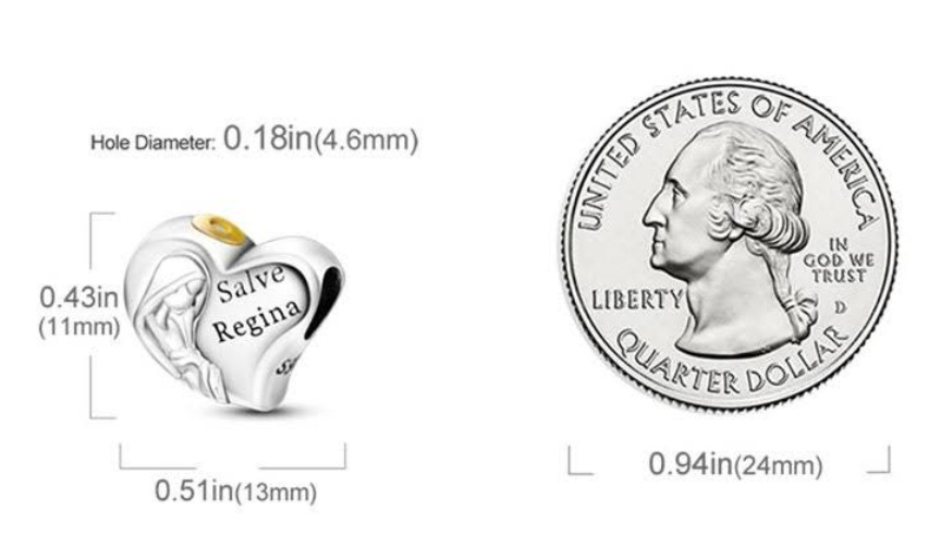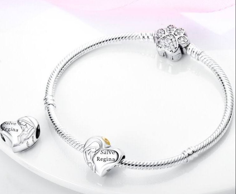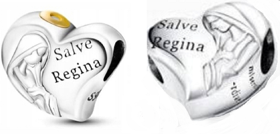 Přívěsek ve tvaru srdce s Pannou Marií s pozlacenou svatozáří a na něm vyrytá slova „Salve Regina“, známá také jako „Hail Holy Queen“ - Zdrávas Svatá Královno. S každým přívěskem vyprávějte svůj příběh a vytvořte náramek, který odráží, kdo jste a co je pro vás důležité. Tvůj styl. Váš náramek. Tvůj příběh.
