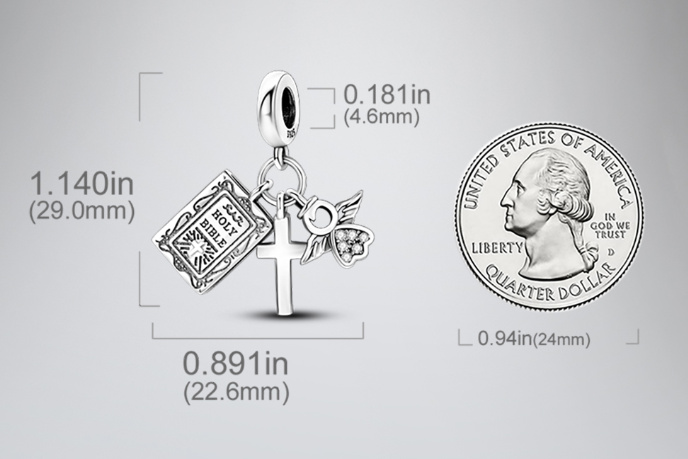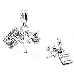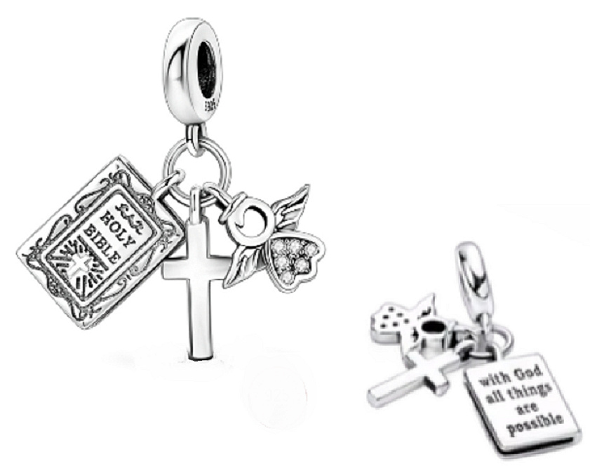 Trojitý přívěsek se svatou Biblí, křížem a andělem, navržený s bílými třpytivými Zirkony. Na zadní straně kouzla Holy Bible jsou vyryta slova „u Boha je všechno možné“.