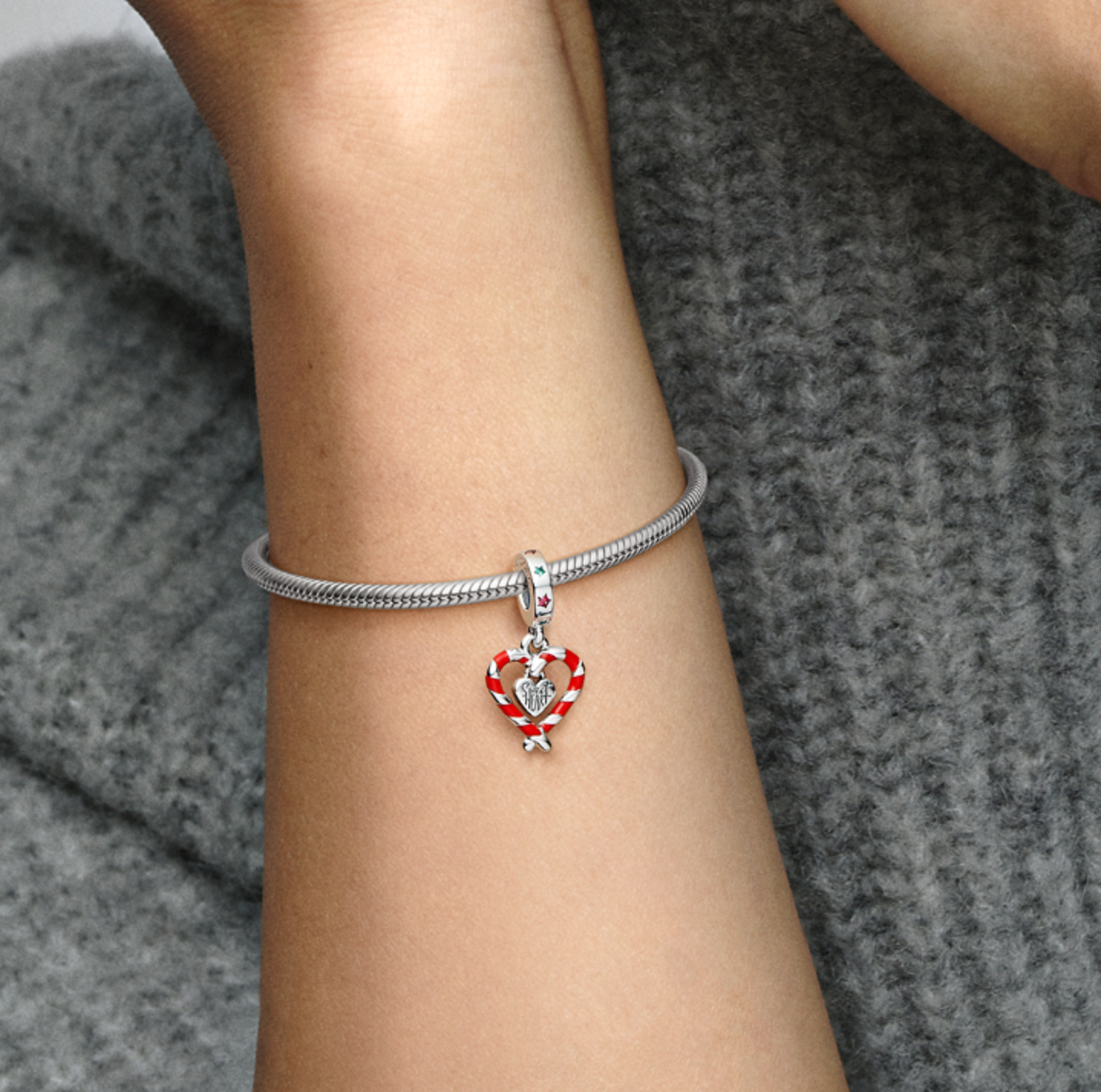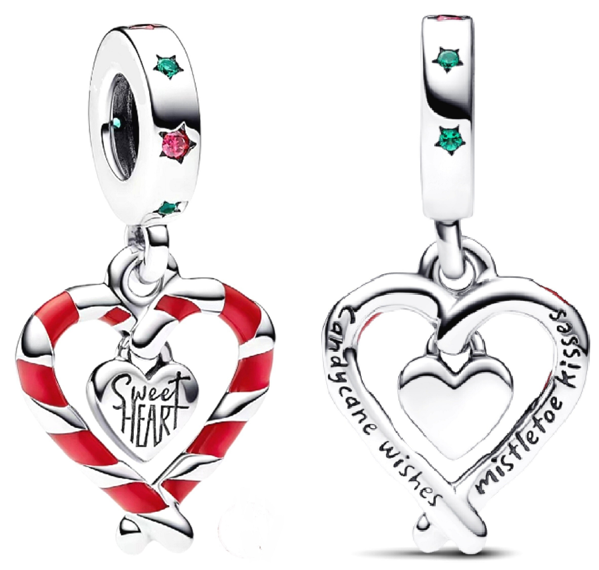 Užijte si sváteční atmosféru naplno s visacím přívěskem Dvě vánoční lízátka ve tvaru srdce. Přívěsek s hůlkovými lízátky odráží hravé tradice tohoto mimořádného ročního období. Dvě hůlková lízátka tvoří srdce s červenými smaltovanými detaily a ve středu visícího srdce je gravírovaný výstižný nápis „Sweet heart" Sladké srdce. Na zadní straně každého hůlkového lízátka jsou gravírované odpovídající vzkazy „Candy cane wishes" Sladké přání a „Mistletoe kisses" Jmelí polibky, díky kterým je přívěsek zábavným a svátečním doplňkem vašich oblíbených přívěsků. Oslaďte si svůj vánočně laděný náramek jedním z vánočních přívěsků.