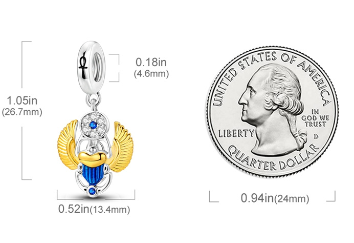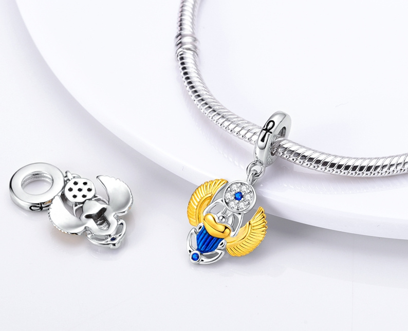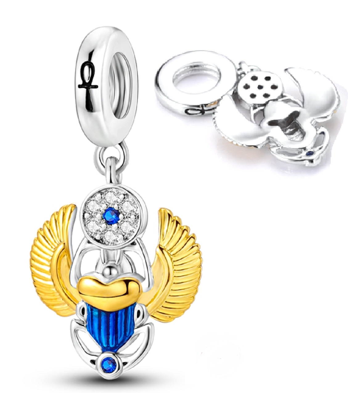 Visací přívěsek se staroegyptským skarabem, symbolem vycházejícího slunce a vzkříšení. Navrženo s pozlacenými křídly, třpytivými modrými a bílými drahokamy Zirkonu a hladkým modrým metalickým smaltem. Prsten přívěsku obsahuje ANKH, známý jako klíč života, symbol věčného života.