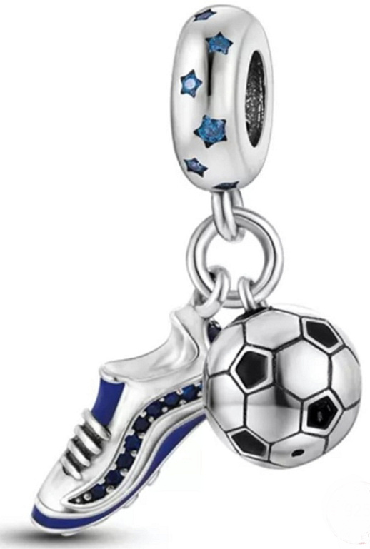 Přívěsek s fotbalovým míčem a botou, navržený s hladkým černomodrým smaltem a zářivě modrými drahokamy Zirkonu. Prsten přívěsku obsahuje malé Hvězdy kolem dokola, zdobené světle modrými třpytivými zirkonovými drahokamy.
