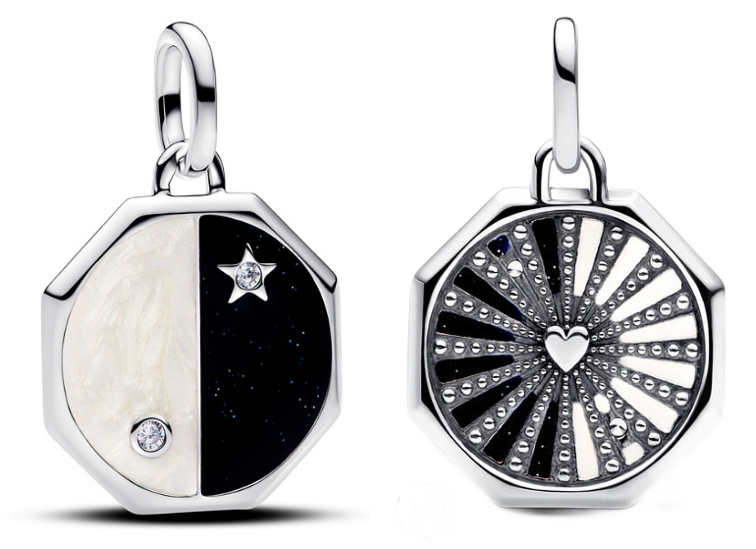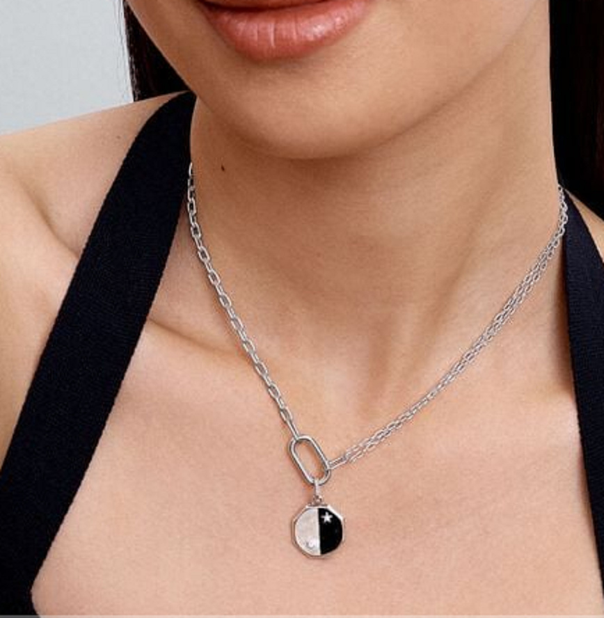 Protiklady se přitahují i v jinovém a jangovém visícím kouzle. Na jedné straně bílo-černý smalt osázený symbolickými kameny zobrazuje cykly dne a noci. Na druhé straně jsou vyřezávané sluneční paprsky, které obklopují centrální srdce zdobené jiskřivými mikrokuličkami. Noste ho jako připomínku rovnováhy a harmonie, které panují ve vesmíru.