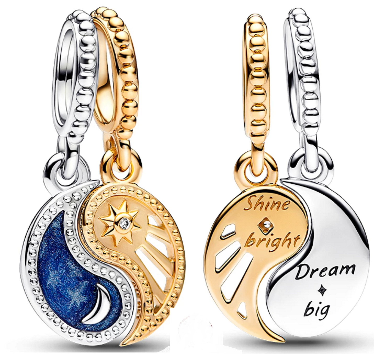 Noste symboly Yin & Yang, které vás vedou a inspirují pomocí dvoubarevného rozdělitelného přívěsku Sun & Moon. Tento sdílený přívěsek kombinuje starodávné symboly: slunce a měsíc a Jin a Jang, které dohromady znamenají rovnováhu, harmonii a propojenost. Visací přívěsek Yang pozlacený má motiv vyvýšeného slunce s vyříznutými paprsky a rytinou „Shine bright“ Zař jasně, na zadní straně, zatímco přívěsek Yin má motiv půlměsíce obklopený třpytivě modrým smaltem a vzkaz „Dream big “ Sni ve velké, vyryto na zadní straně.