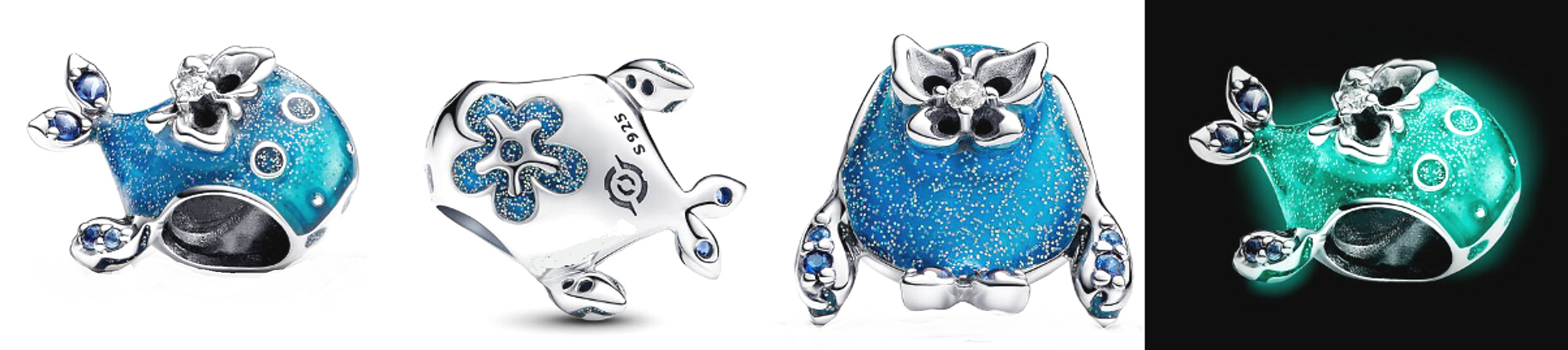 smaltovanými spirálovými liniemi na rubu s montážními otvory, každá ploutev je zdobena sklem, na rubu jsou také montážní otvory. Korálek svítí ve tmě.