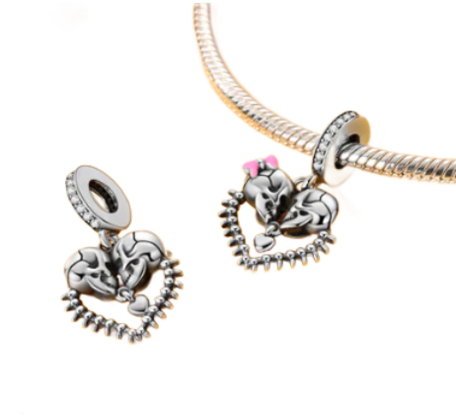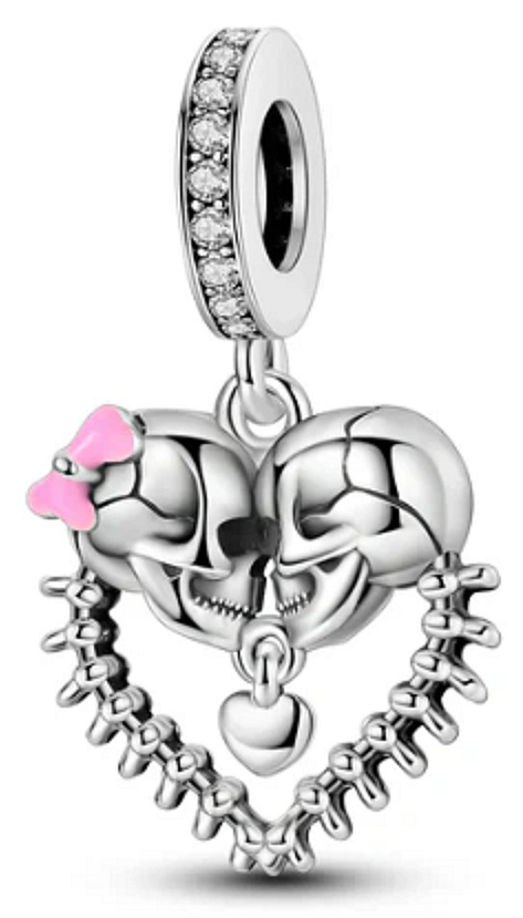 Přívěsek s visícím srdcem se dvěma lebkami uvnitř, navržený s hladkým růžovým smaltem a zářivě bílými drahokamy Zirkonu na prstenu přívěsku.