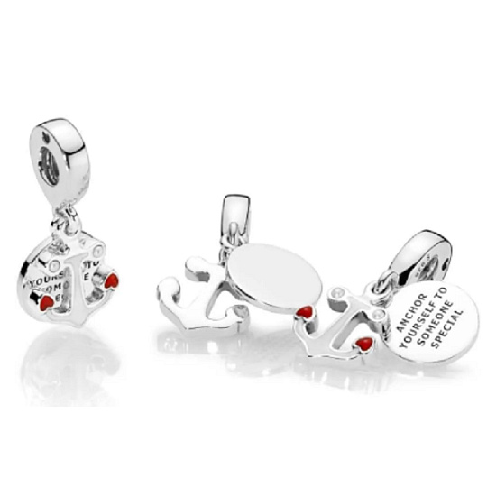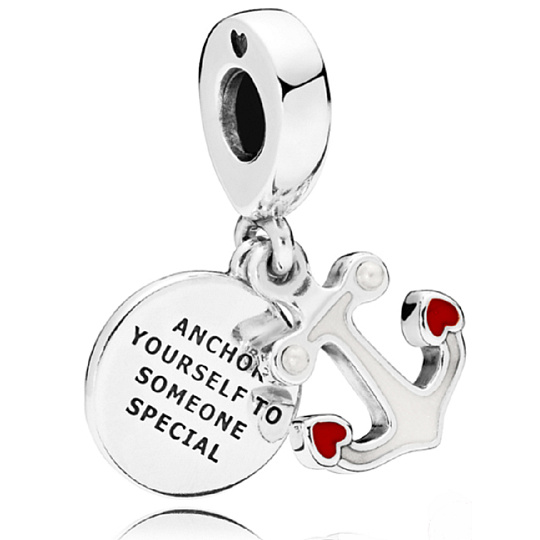 Pěkný přívěsek s námořnickým dojmem má disk se zprávou „Ukotvěte se k někomu výjimečnému“ a mini kotvu se dvěma červenými smaltovanými srdíčky.