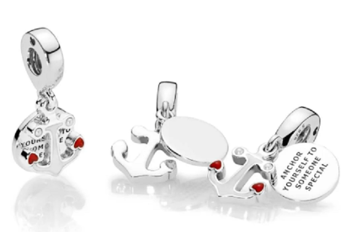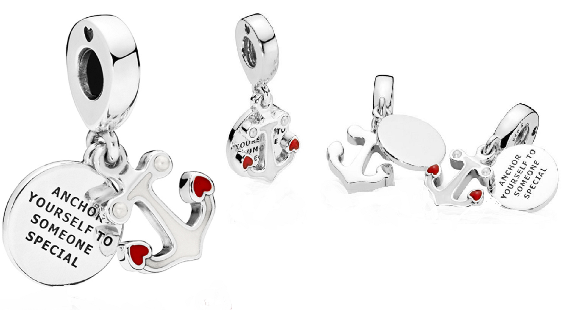 Pěkný přívěsek s námořnickým dojmem má disk se zprávou „Ukotvěte se k někomu výjimečnému“ a mini kotvu se dvěma červenými smaltovanými srdíčky.