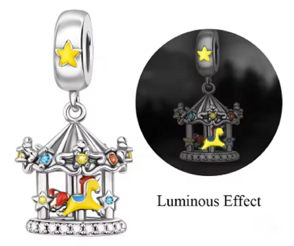 Tento půvabný přívěsek ve tvaru kolotoče je symbolem radosti, nostalgie a hravé energie. Barevné detaily v kombinaci s unikátním svítícím efektem ve tmě (luminous effect) rozzáří tvůj náramek i tvůj den. Ručně smaltované detaily v zářivých barvách dodávají šperku kouzelný vzhled. Symbol radosti, hravosti a bezstarostného dětství.