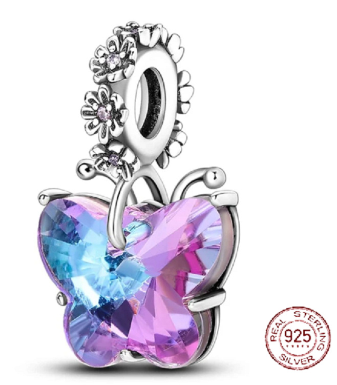 Visací přívěsek s fialovým a modrým motýlem, navržený s velkým třpytivým drahokamem Zirkonem. Prsten má kolem dokola drobné kvítky zdobené fialovými zirkonovými drahokamy. Originální design přívěsku, kvalitní zpracování, ručně dohotovené.