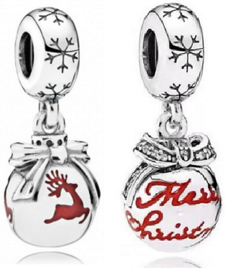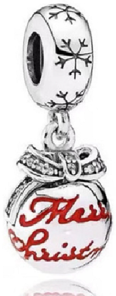 Přívěsek v podobě slavnostní vánoční ozdoby, zdobený mašlí a nápisem "Merry Christmas!" který je z červeného smaltu.