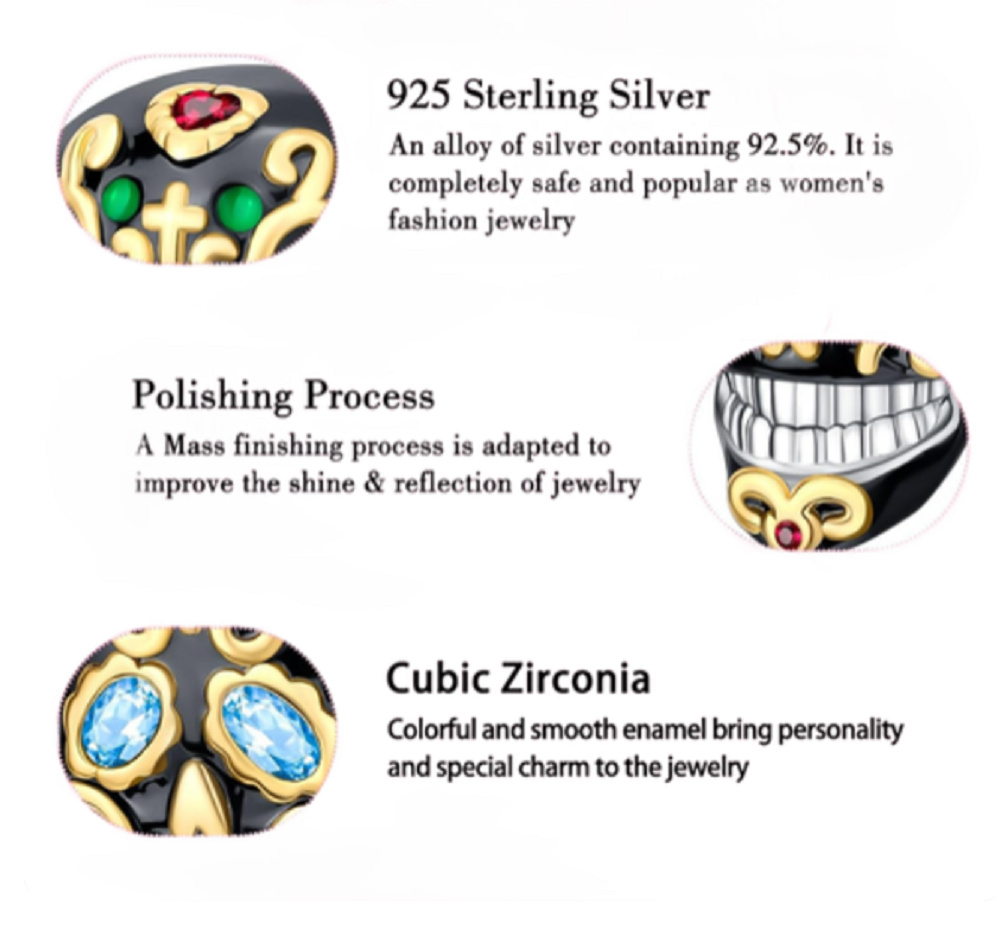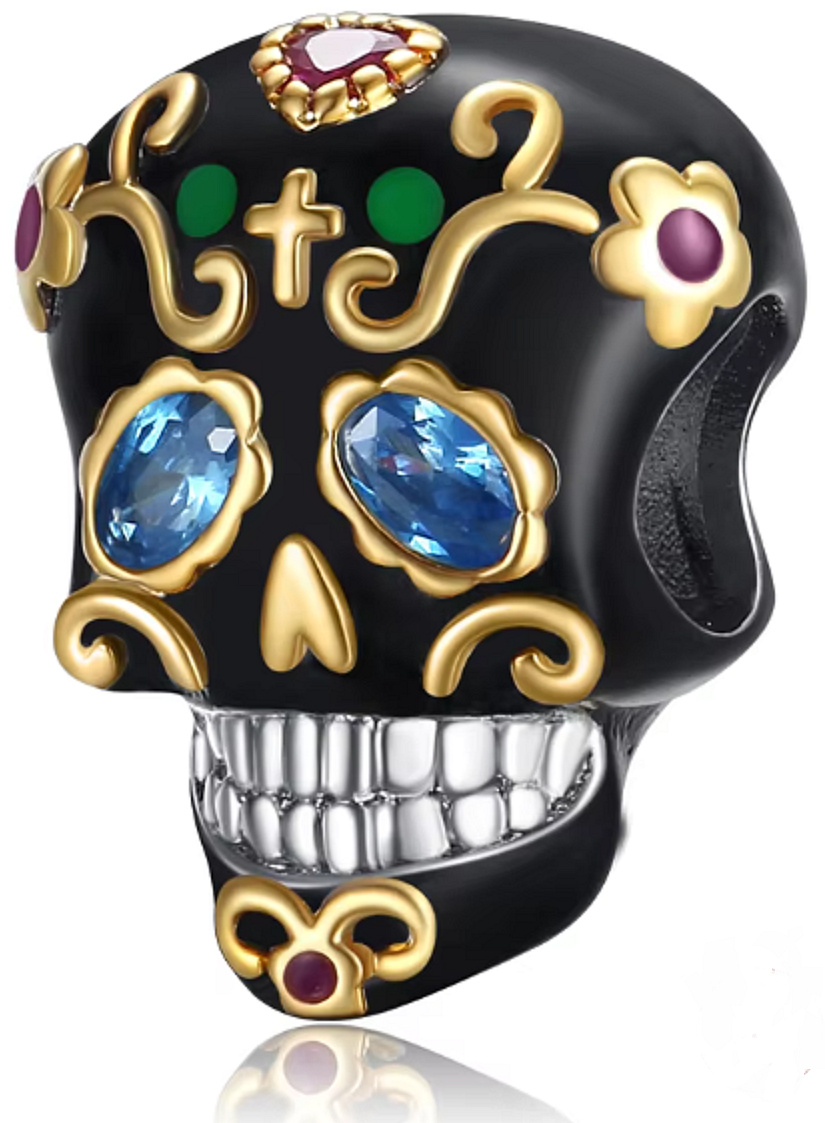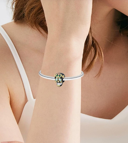 Korálek ve tvaru lebky je dekorován Zirkony a smaltem. Výhodou tohoto jednoduchého přívěsku je, že může zkrášlit nejen Váš náramek nýbrž i Váš náhrdelník.