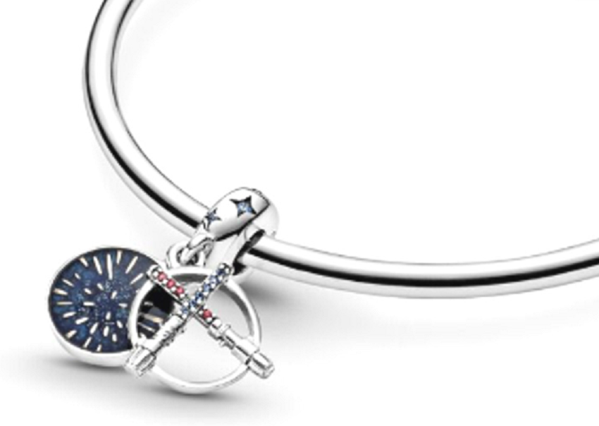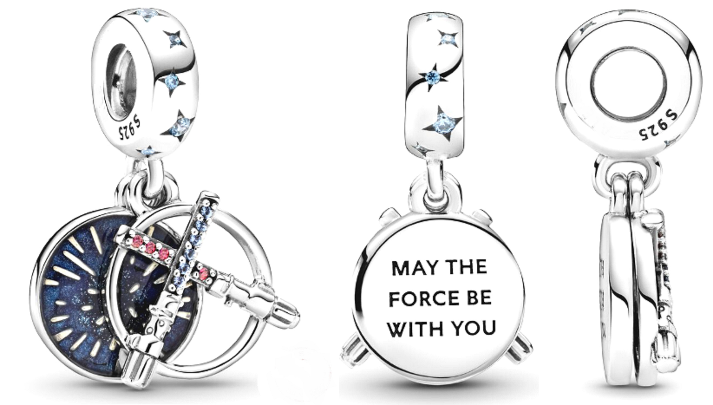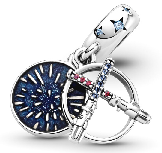 Staňte se neporazitelným s dvojitým světelným mečem Dangle Charm z kolekce Star Wars. Design je inspirován úvodní scénou ságy Star Wars, která ukazuje galaxii plnou hvězd. Přední disk je ručně vyrobený a obsahuje dva zkřížené světelné meče. Jeden je zdobený červenými kameny a druhý modrými kameny. Zadní disk zdobí ručně aplikovaný třpytivý modrý smalt, nesčetné množství hvězd a rytina „May the Force be with you“ - "Nechť tě provází síla" na zadní straně.
