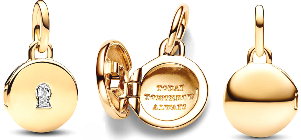 Mějte to, co je vám nejdražší, blízko k vašemu srdci s otevíratelným a gravírovatelným přívěskem. Tento přívěsek má na přední straně čirý kámen kubické zirkonie ve tvaru klíčové dírky a bezpečně se otevírá a zavírá, takže uvnitř můžete mít malý obrázek, poznámku nebo pramen vlasů. Uvnitř medailonu je vyryto sdělení „DNES ZÍTRA VŽDY“ a zadní strana je prázdná pro vlastní rytinu. Noste jej na náhrdelníku nebo náramku, jako symbol udržování vaší lásky v bezpečí a připomínku, abyste si ji vážili každý den.