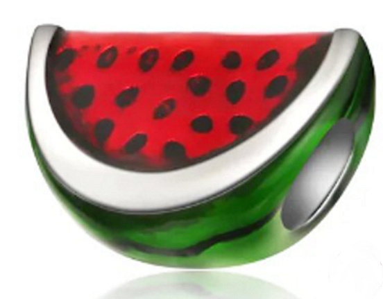 Máte rádi Vodní meloun? Tato plodová zelenina sice neodmyslitelně patří k letním měsícům, ale díky tomuto stylovému korálku se můžete 'osvěžit' i během roku. Korálek je zdoben ručně nanášeným transparentním zeleným a červeným smaltem, který umožňuje prosvítání základny.