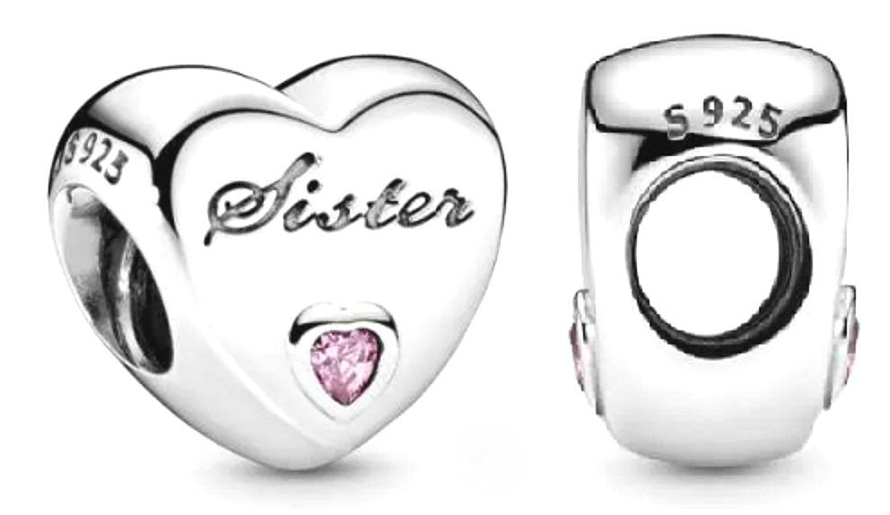 Přívěsky na náramek jsou vyrobeny pro vás, abyste vyjádřili, koho máte rádi – něco, někde nebo někoho. Sestry - rodinné kouzlo vyrobené na oslavu pouta mezi sourozenci je ve tvaru srdce. Jednoduchý, ale smysluplný korálek vyleštěný do vysokého lesku je zdoben růžovými Zirkony ve tvaru srdce a rytinou „Sister“.