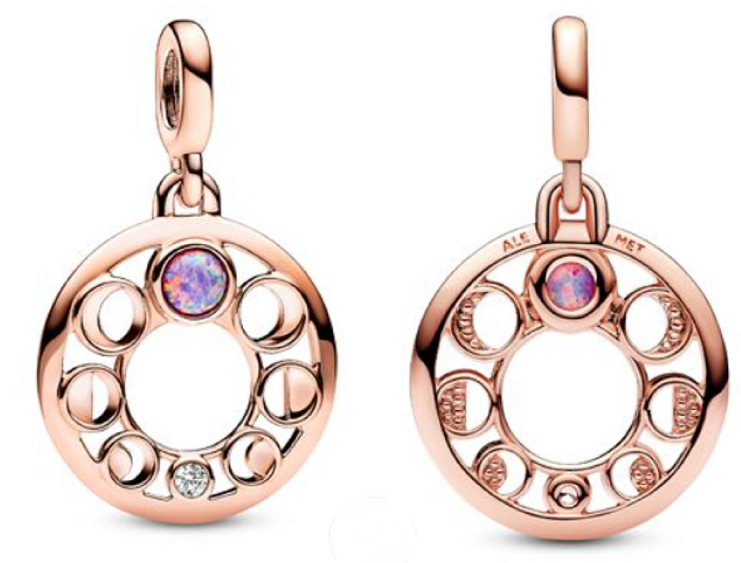 Nastavte své záměry stylově s medailonem Fáze Měsíce. Tento medailon jemně pozlacený růžovým zlatem, s detaily - růžového Opálu jako novoluní nahoře a čirou Kubickou Zirkonií jako úplňkem ve spodní části, ukazuje osm fází Lunárního cyklu, které představují intuici. Stejně jako se měsíc neustále mění, měníte se i vy. Upravte svůj styl jako připomínku péče o sebe a nechte každou fázi vést vaši cestu osobního růstu. Noste tento významný medailon na řetízcích, náhrdelnících, prstenech a kruhových náušnicích.