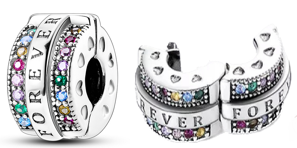 Přívěsek s barevnými třpytivými drahokamy Zirkonu a vyrytým slovem „Forever“. Na přední a zadní straně přívěsku jsou kolem dokola malá srdíčka.