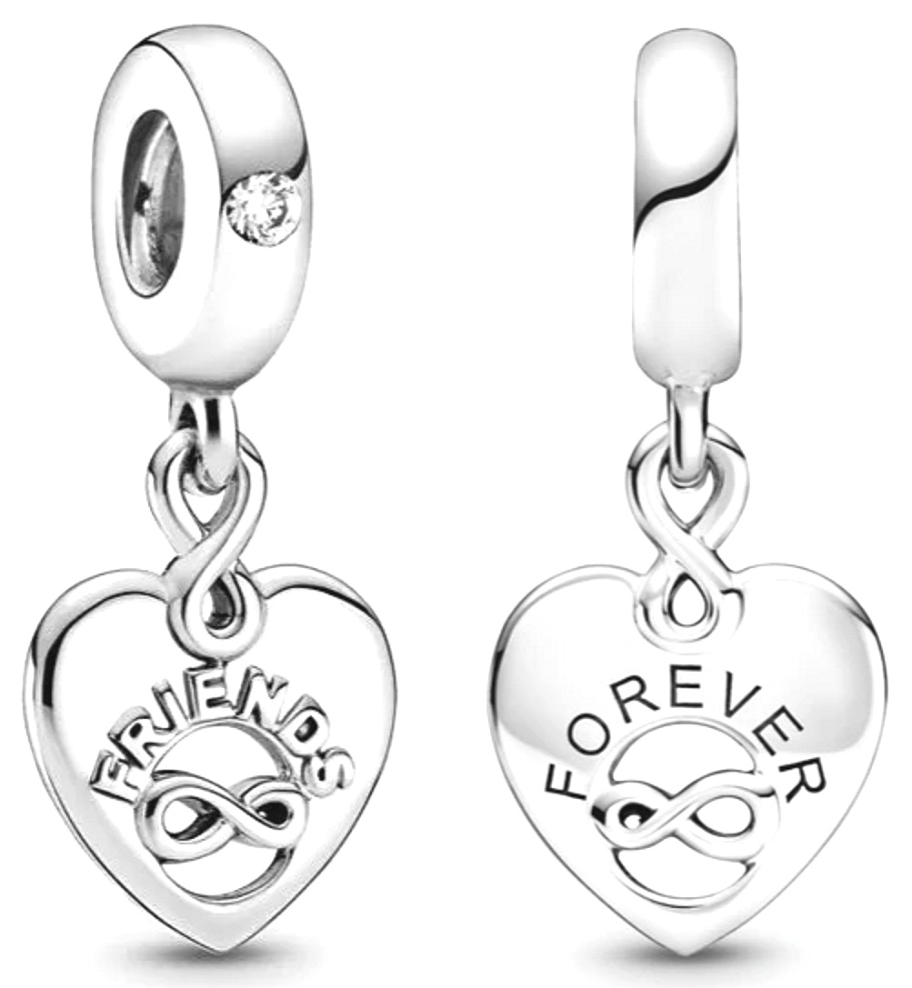 Stylový visací přívěsek, ve tvaru romantického srdce se symbolem nekonečno, zdoben nápisem Friends Forever a čirým třpytivým kamínkem kubické zirkonie. Dopřejte si romantický doplněk, kterým rozzáříte svůj náramek.