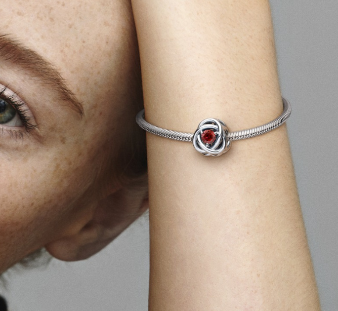 Korálek s motivem věčnosti. Dodejte svým náramkům a přívěskům šmrnc pomocí tohoto věčného kruhu. Tento speciální kousek je vyroben ve tvaru nekonečného copu a ve svém středu je osazen červeným krystalem. Symbolizující věčnost, přidejte toto jiskřivé kouzlo do svého stylu, aby vaše každodenní šperky získaly jasnou aktualizaci.