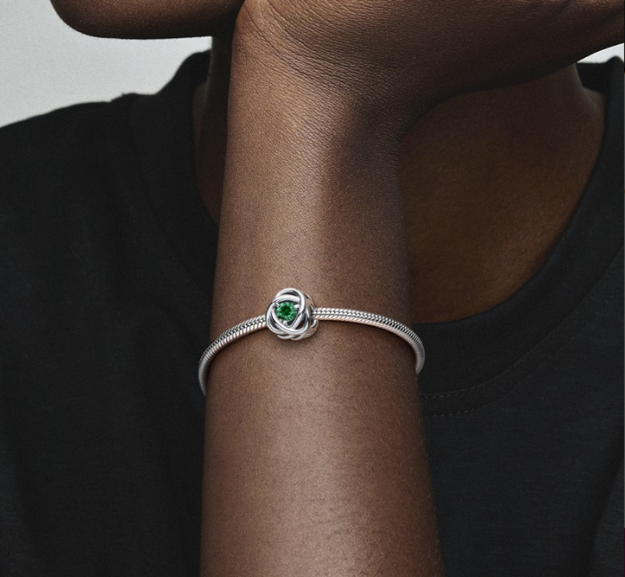 Korálek s motivem věčnosti. Dodejte svým náramkům a přívěskům šmrnc pomocí tohoto věčného kruhu. Tento speciální kousek je vyroben ve tvaru nekonečného copu a ve svém středu je osazen zeleným krystalem. Symbolizující věčnost, přidejte toto jiskřivé kouzlo do svého stylu, aby vaše každodenní šperky získaly jasnou aktualizaci.
