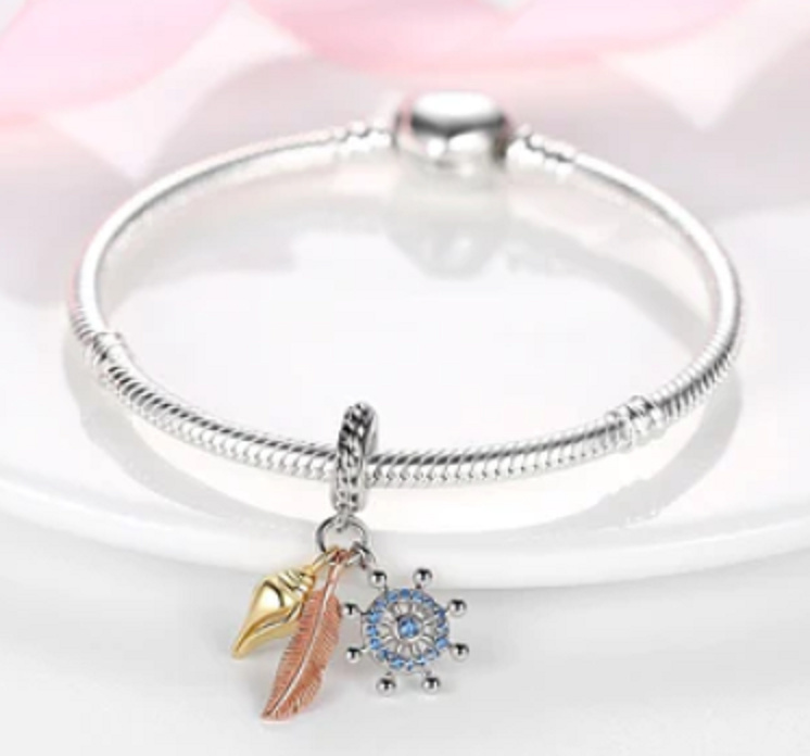 Kormidlo - představuje ukazatele osudu, ten, kdo nasměruje ostatní správným směrem. Ulita - chraňte, co máte rádi. Pírko - ochrana vzdušným živlem - symbol ochrany, svobody, jasné mysli. Visací přívěsek s Mušlí, perem z Racka a kormidlo, navržené s modrými třpytivými Zirkony.