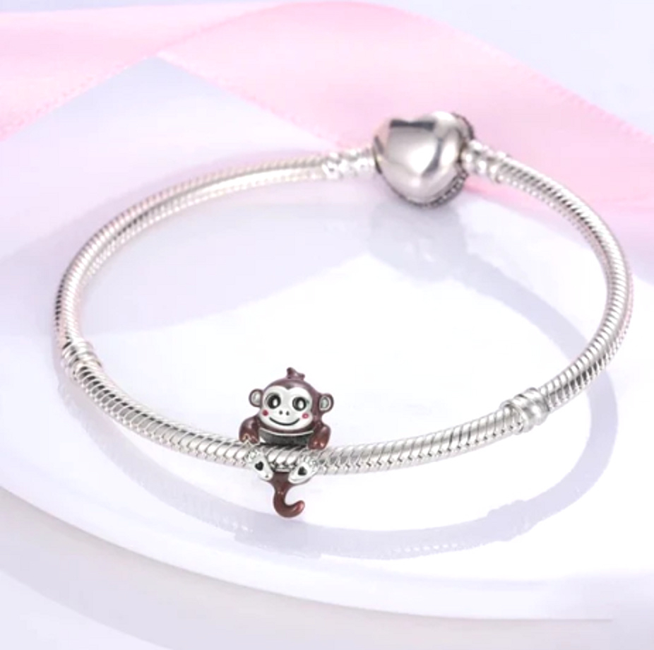Přívěsek s roztomilou opičkou se dvěma malými srdíčky na chodidle, navržený s hladkým hnědým, černým a červeným smaltem. Opice symbolizují moudrost, radost a soucit. S každým přívěskem vyprávěj svůj příběh a vytvoř si náramek, který odráží, kdo jsi. Tvůj styl. Tvůj náramek. Tvůj příběh.