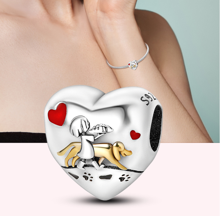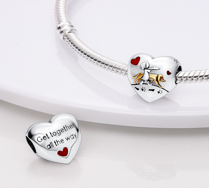 Milujete svého pejska tak moc, že ho chcete mít u sebe při každém kroku? Přívěsek ve tvaru srdce s malou holčičkou se svým psem. Má na sobě holínky a koláč. Navrženo s hladkým červeným a černým smaltem a pes je pozlacený. Na zadní straně přívěsku je vyrytý nápis „Get together all way“ Dejte se dohromady, s malým červeným smaltovaným srdcem