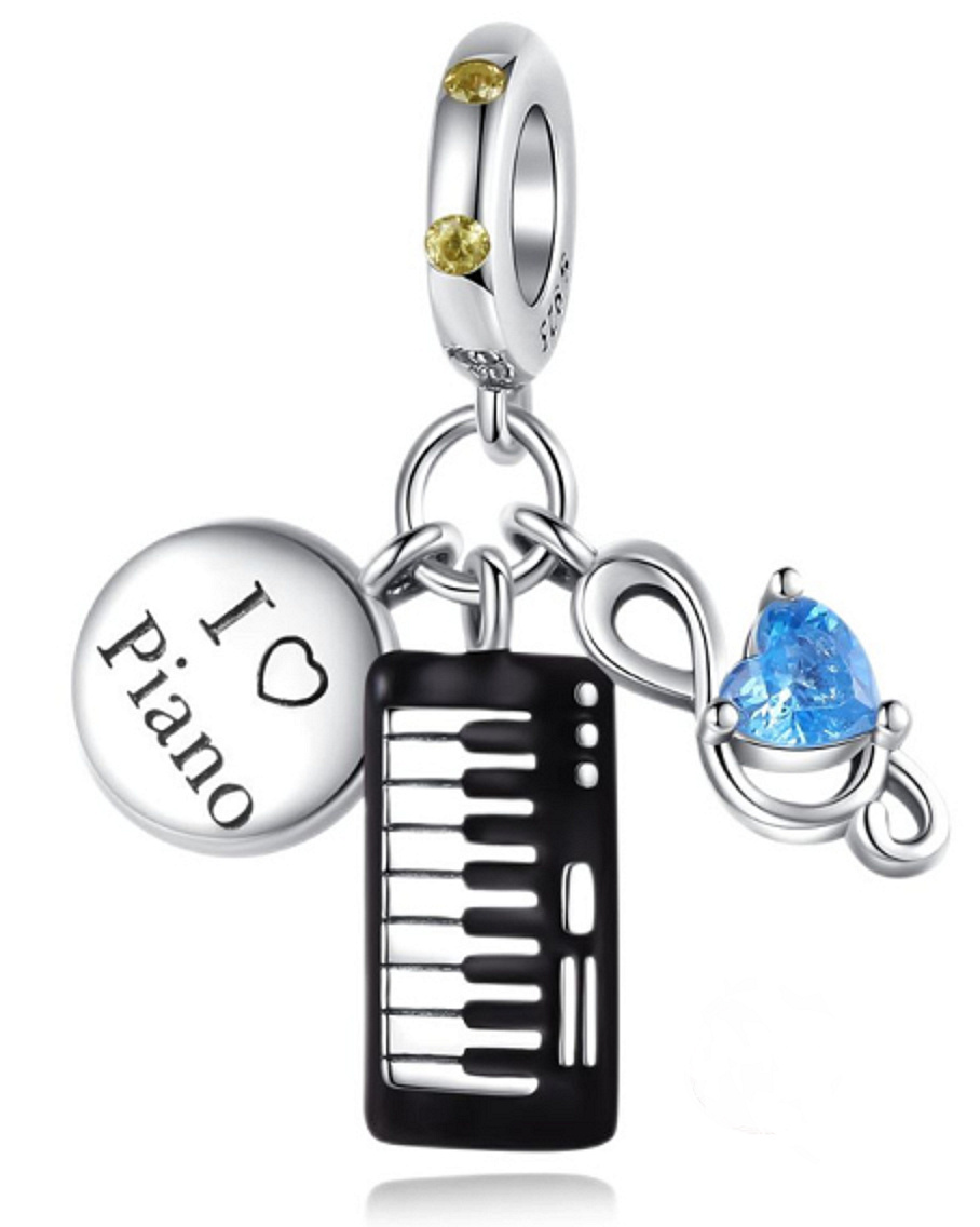 Trojitý přívěsek s klávesnicí - piana, houslovým klíčem a cedulkou s nápisem - "Miluji piano" dekorováno hladkým černým smaltem. Prsten přívěsku obsahuje dva třpytivé drahokamy Zirkonu. S každým přívěskem vyprávěj svůj příběh a vytvoř si náramek, který odráží, kdo jsi. Tvůj styl. Tvůj náramek. Tvůj příběh.