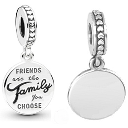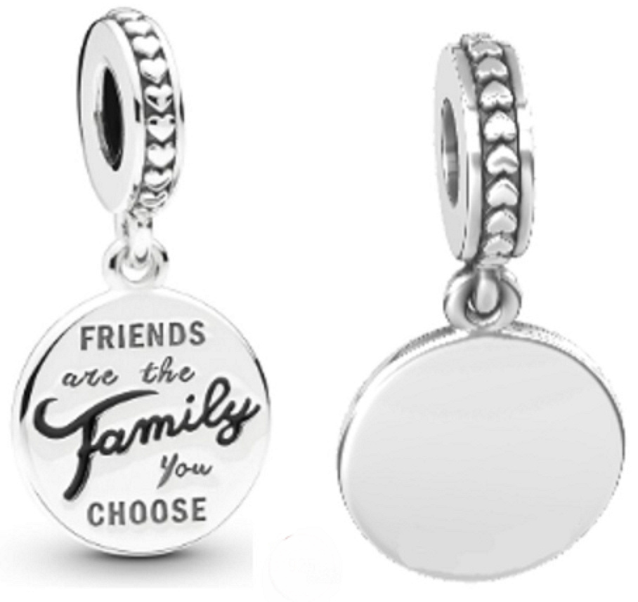 Tento přívěsek si zamilujete na první pohled nebo jej darujete milované osobě, abyste vyjádřili svou drahocennou náklonnost. Na houpacím disku je vyryto „Přátelé jsou rodina, kterou si vyberete“ a „rodina“ zvýrazněno ručně malovaným černým smaltem. Smyčku obklopuje malá srdce.