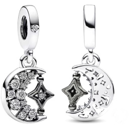 Oslavte lásku a dualitu s třpytivým srpkem měsíce a otočným přívěskem Hvězdy. Přívěsek je se dvěma motivy noční oblohy, jasným Měsícem a tmavou rutheniem pokovenou hvězdou, která je plná magických kontrastů. Tmavá hvězda má ve svém středu kámen, prolamované detaily a může se otáčet, zatímco srpek měsíce je pevný a také se třpytí různě velkými kameny. Tento přívěsek, inspirovaný čínským Valentýnem, kombinuje romantiku lásky a noční oblohy a je ideálním dárkem pro milovanou osobu.