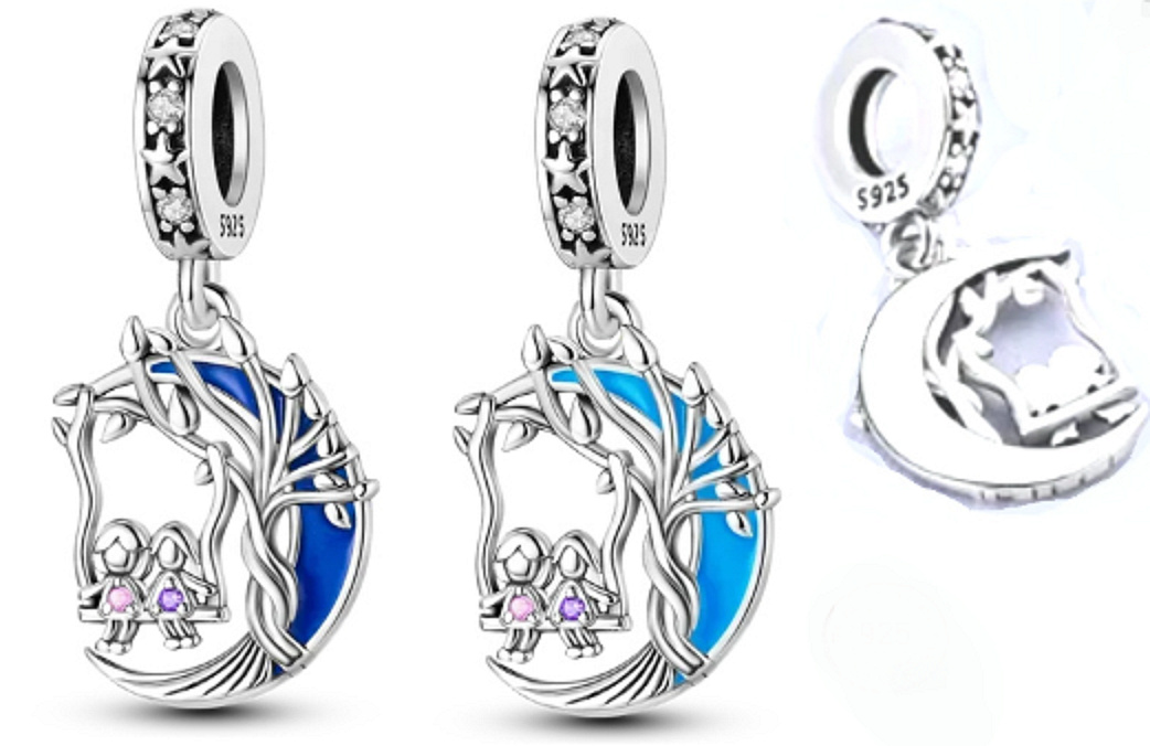 Přívěsek zářící ve tmě s prolamovaným designem, se stromem a dvěma sestrami na houpačce pod půlMěsícem. Navrženo s hladkým modrým smaltem a jiskřivými růžovými, fialovými a bílými drahokamy Zirkonu. Na prstenu kouzla jsou kolem dokola malé hvězdičky. Strom symbolizuje rodinné spojení a kruh života.