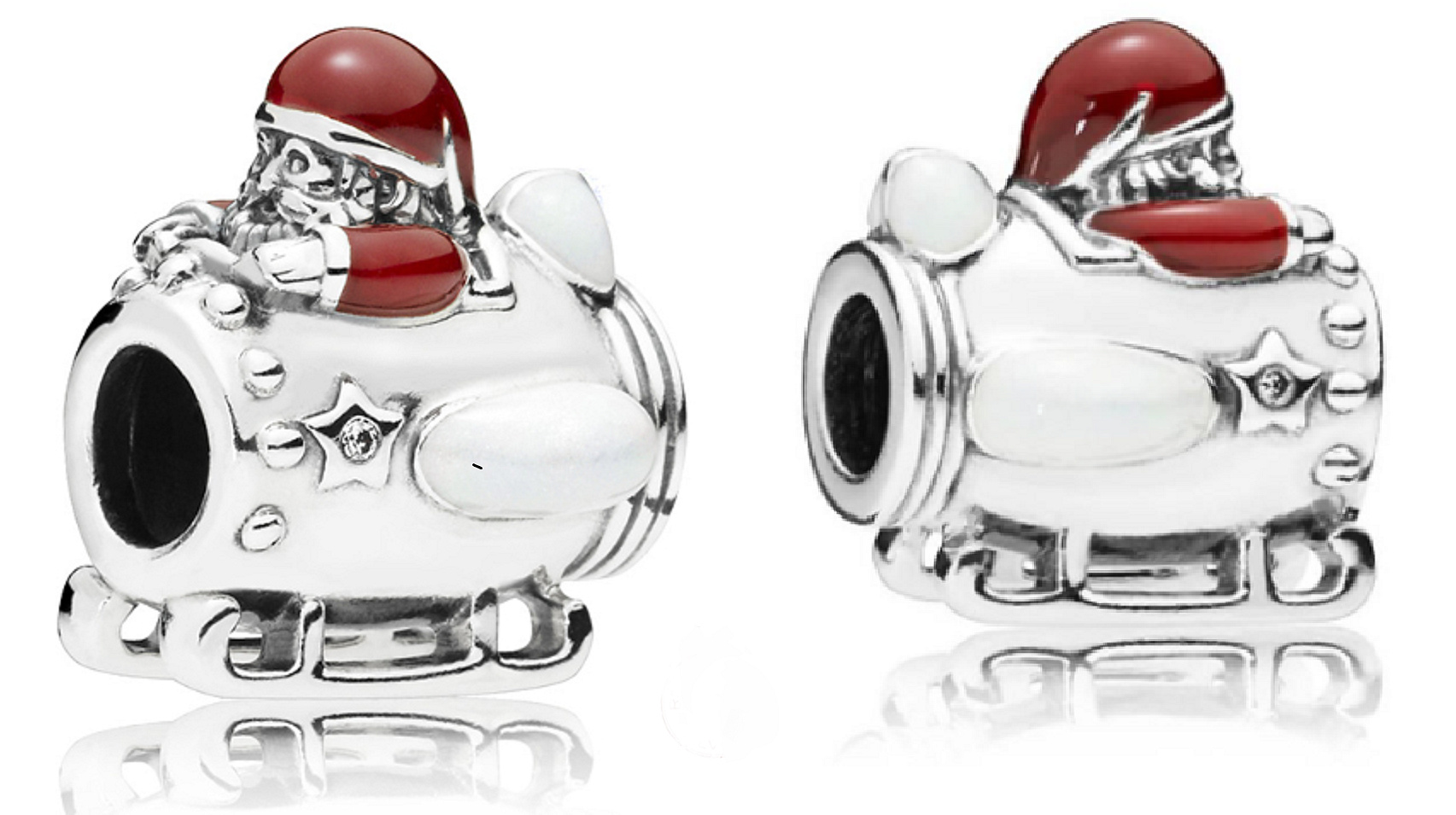 Vánoční přívěsek, zdoben smaltem. Korálek Santa je ve velké santovské čepici sedící v raketě. Velká červená čepice zakrývající oči.