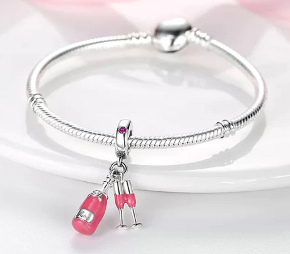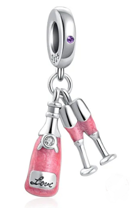 Přívěsek se dvěma skleničkami na šampaňské a lahví šampaňského, navržený s hladkým růžovým smaltem a zdobený bílým třpytivým zirkonovým drahokamem a vyrytým slovem "Love". Prsten obsahuje ladící růžový zirkonový drahokam. Dokonalé kouzlo pro připomenutí zvláštního dne nebo narozeninové oslavy.